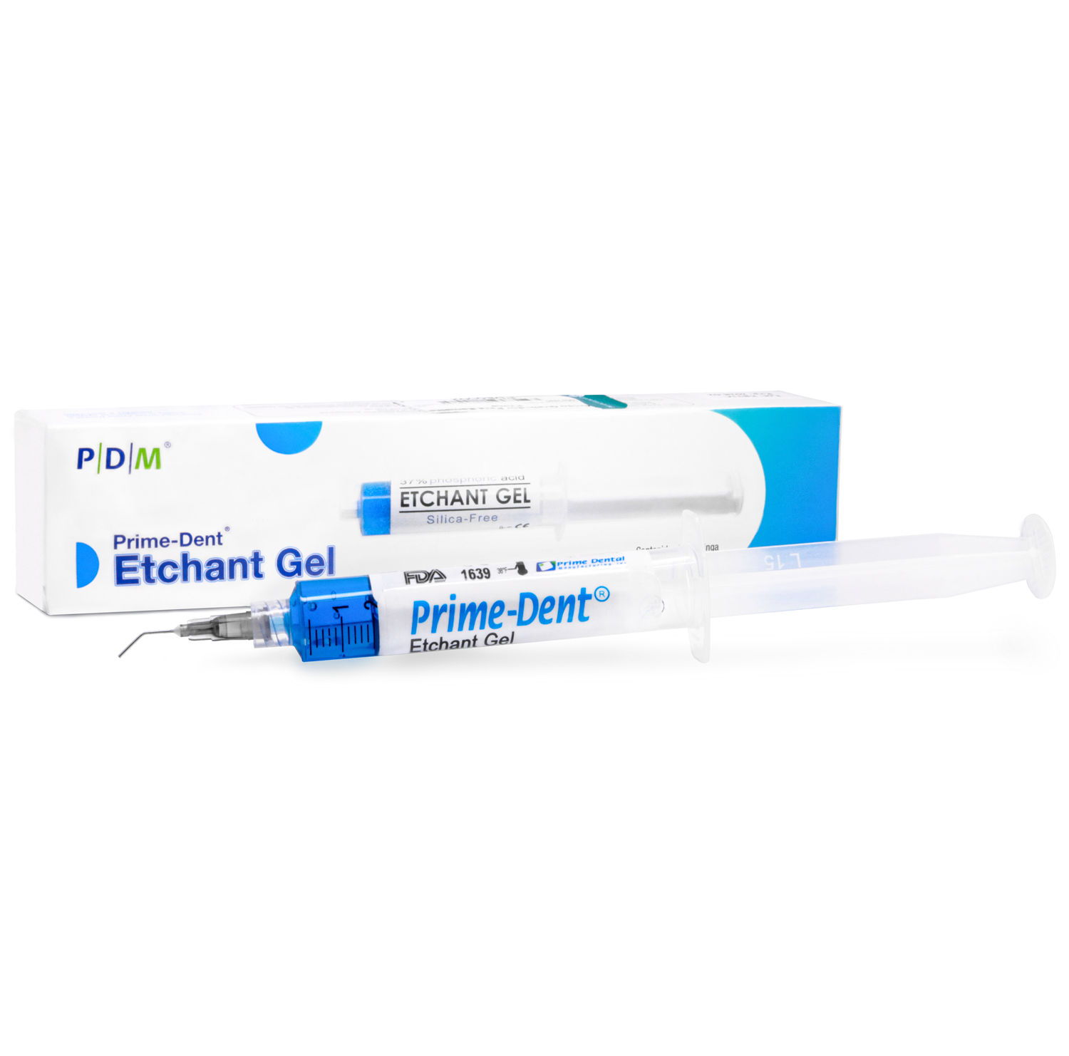 Prime-Dent® Etchant Gel/Liquid con ácido fosfórico al 37%, se utiliza para grabar los procedimientos de adhesión.