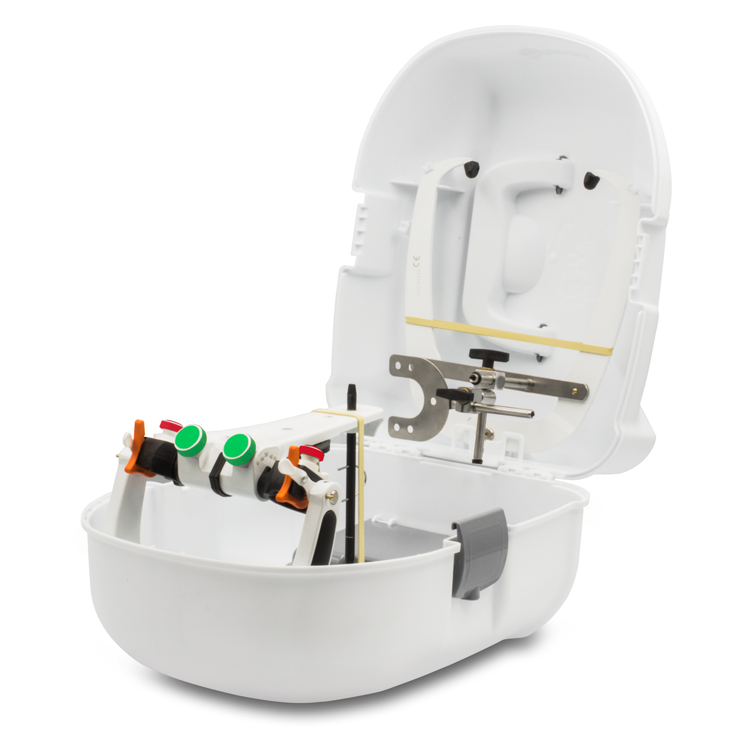 El arco facial registra la posición espacial de la arcada superior del paciente trasladandose al articulador. La transferencia de esta posición con el modelo Standard es fijando el arco facial completo en el articulador. El arco facial estándar posee mariposas de apriete manual, eliminando los inconvenientes causados por el uso de la llave.