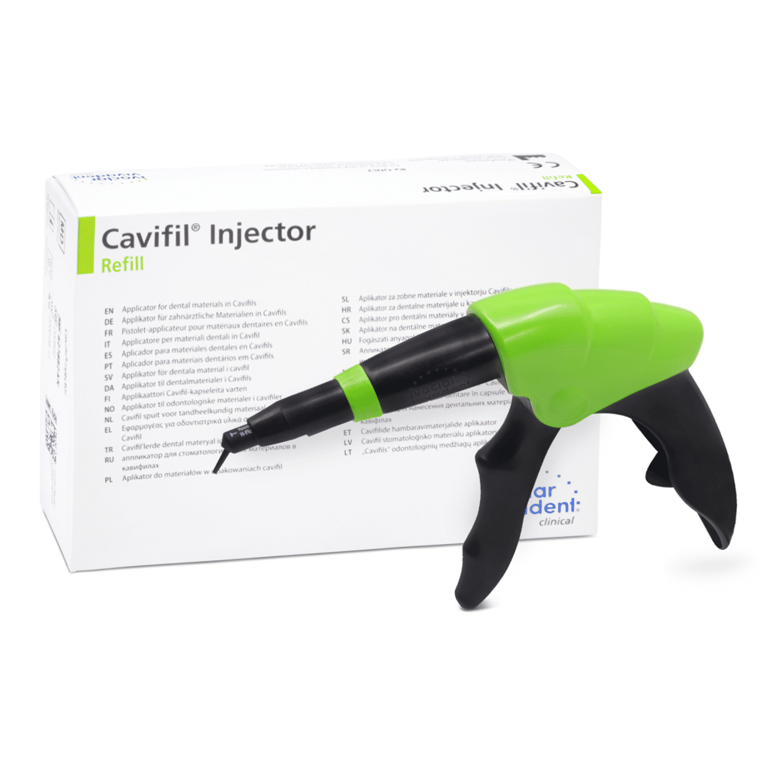 El Inyector Cavifil permite llegar cómodamente a los molares en la parte posterior de la cavidad oral. Según la posición de la mandíbula y la cavidad, las cápsulas que contienen los materiales de restauración, conocidas como Cavifils, se pueden girar 360° en el inyector. Además, los materiales de alta viscosidad se pueden dosificar con facilidad debido a la alta relación de transmisión del inyector. Los Cavifils se pueden cambiar fácilmente.
