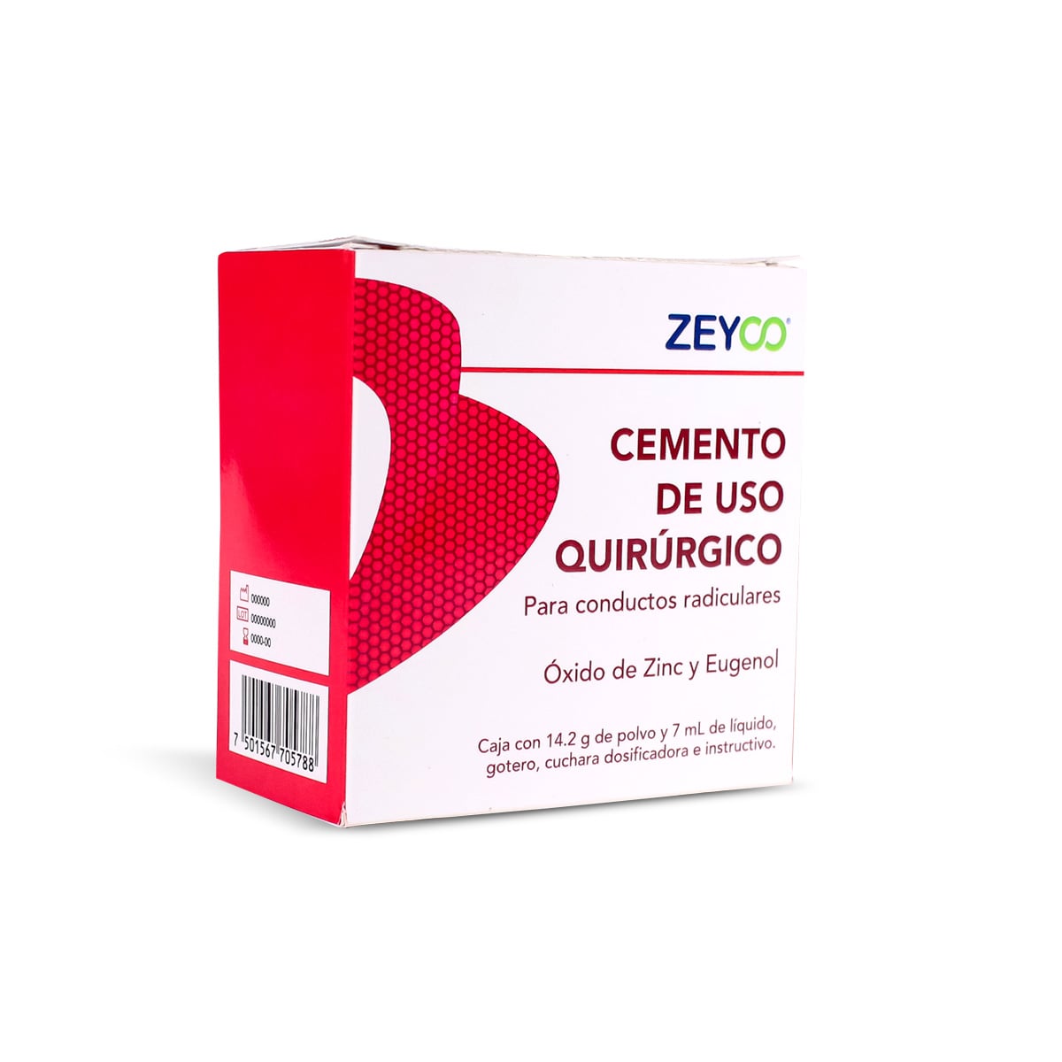 Cemento de Uso Quirúrgico Zeyco está formulado a base de óxido de zinc y eugenol. Ideal para el sellado de los conductos radiculares en el tratamiento endodóntico. Se utiliza para rellenar las irregularidades y discrepancias que existen entre el material de obturación y las paredes del conducto logrando así un sellado hermético.