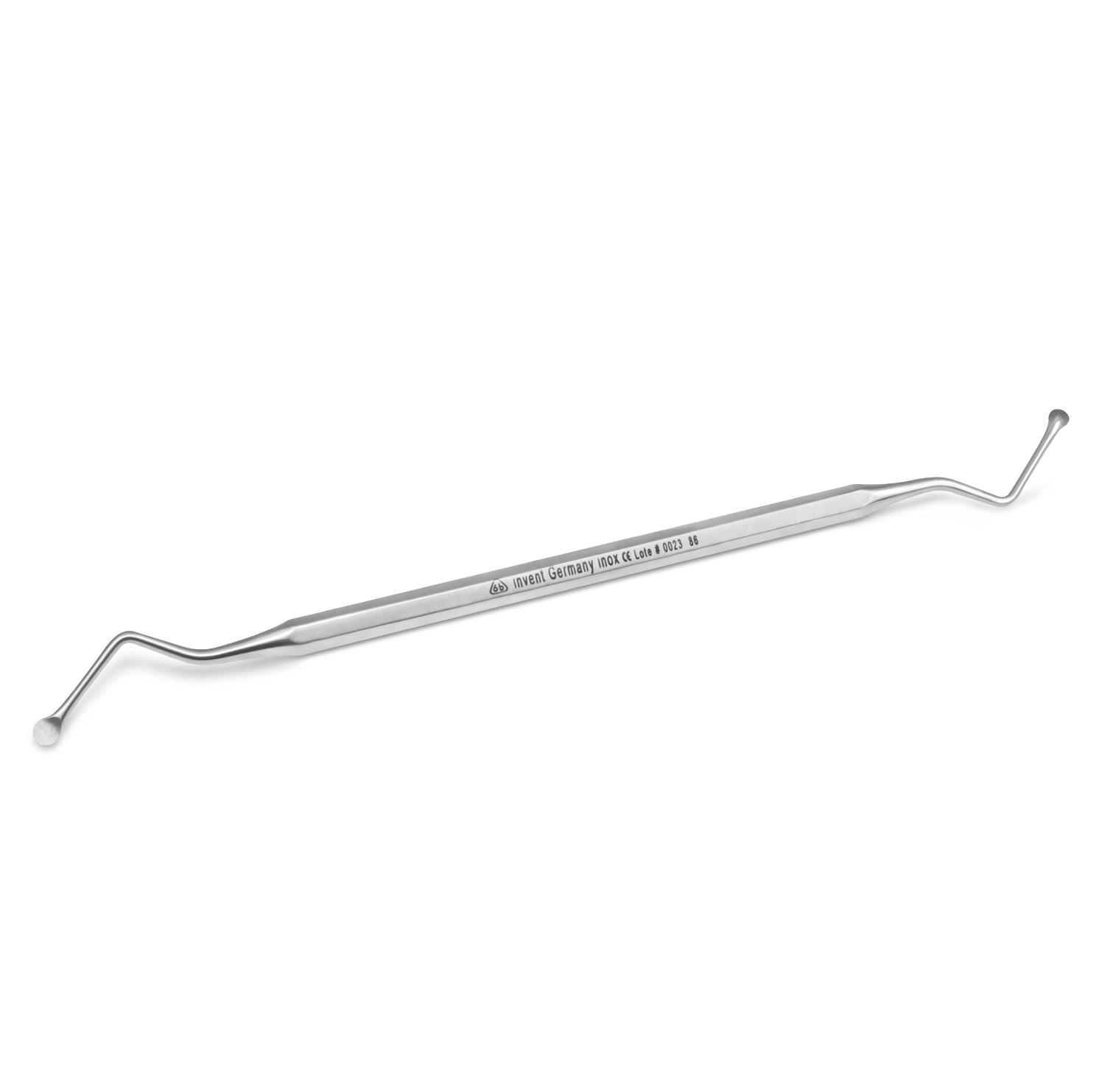 La Cureta Lucas 6b Invent Germany #86 es un instrumento quirúrgico de doble extremo con puntas activas tipo cuchara (Lucas), fabricado en acero inoxidable autoclavable de alta calidad. Cuenta con un mango hexagonal que provee agarre seguro y antideslizante, diseñado para realizar curetaje y limpieza eficiente de alvéolos dentales, desbridamiento de tejido posoperatorio o remoción de quistes.