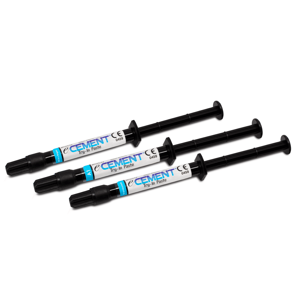 eCEMENT es un sistema de cementación de resina diseñado para simplificar la colocación de restauraciones de disilicato de litio (por ejemplo, IPS e.max® *). El disilicato de litio es una vitrocerámica a base de sílice disponible en formas prensadas y molidas, con opacidades altas y medias, y translucidez alta y baja. El sistema eCEMENT contiene cemento de resina de fotopolimerización y de curado dual, lo que garantiza que todas sus restauraciones de disilicato de litio tendrán una retención y una estética excepcionales. El sistema eCEMENT también se puede utilizar para la cementación de todas las restauraciones, incluidas carillas, inlays, onlays, coronas, puentes de tres unidades, bloques CAD / CAM y lingotes prensables de disilicato de litio.