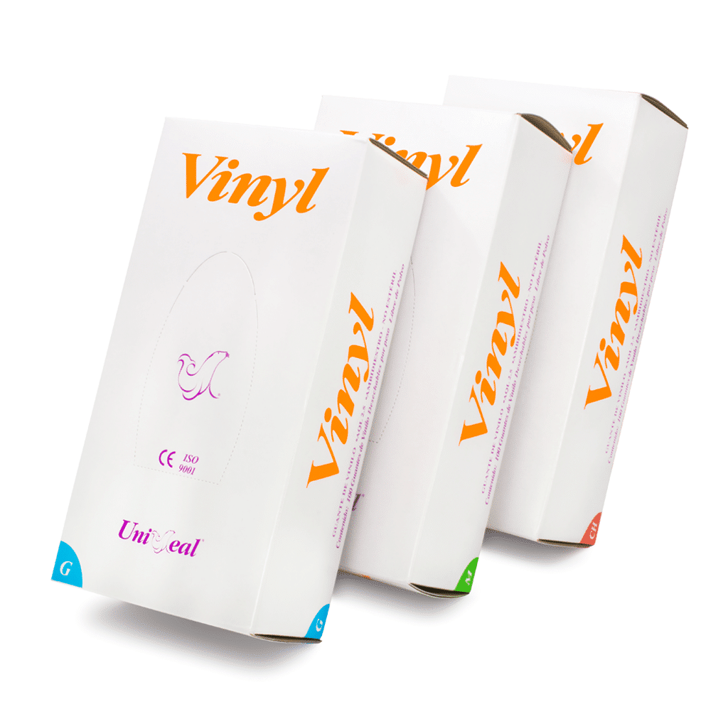 UniSeal Vinyl Libres de Polvo son Guantes de Vinilo libre de polvo lubricante USP para exámen con superficie Lisa, ambidiestros, no estériles.