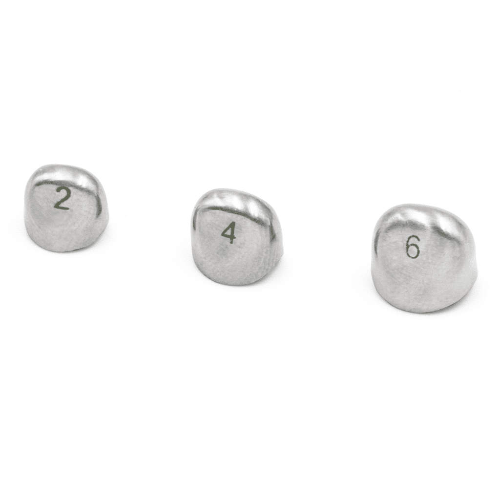 Kit de Coronas de Acero Cromo Anteriores Infantiles DENTEAM, son fabricadas en acero inoxidable, austenítico ligeramente magnético de grado quirúrgico. AISI 302 (8/18 níquel cromo)