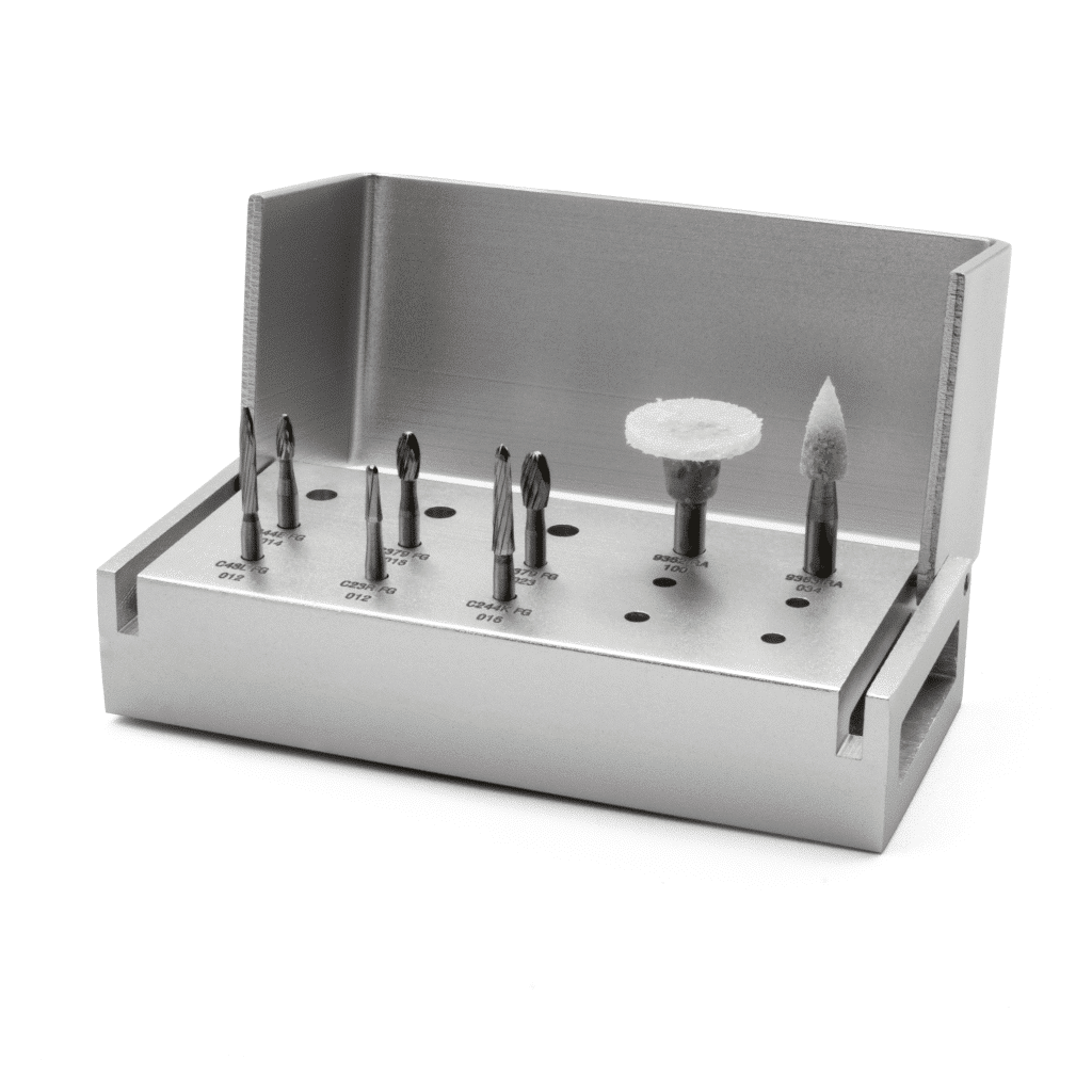 - Instrumentos con una geometría de corte redondeada para una remoción cuidadosa de los restos de adhesivo sin dañar el esmalte dental