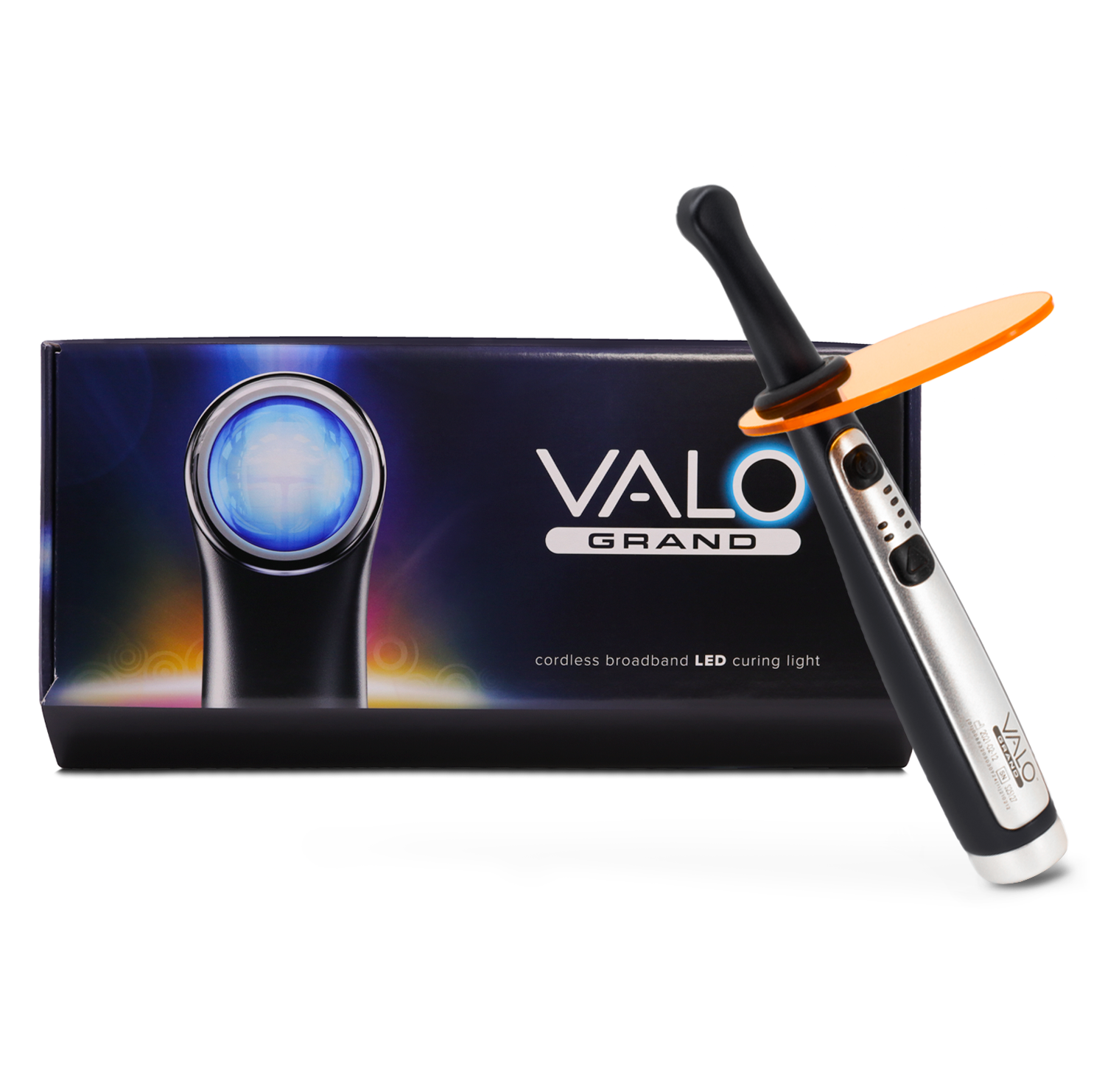 La lámpara VALO Grand utiliza un diodo emisor de luz de longitud de onda múltiple (LED) para producir luz de alta intensidad de 385-515 nm, capaz de polimerizar todos los materiales dentales de polimerización por luz. Esta intensidad penetrará también la porcelana y es capaz de polimerizar cementos que se encuentren bajo la resina, en forma similar a una lámpara halógena de calidad.