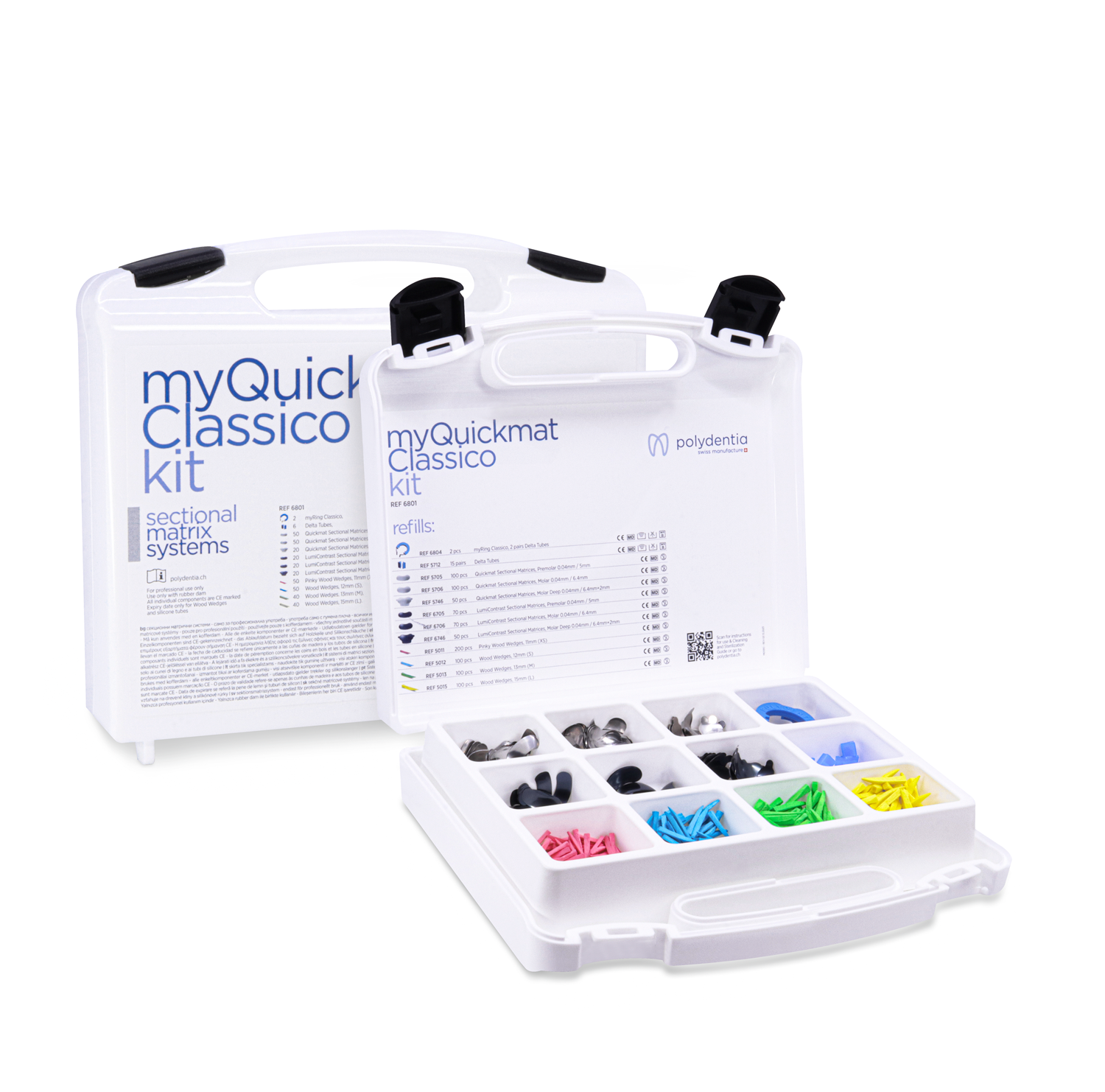Este kit incluye myRing Classico de Polydentia, un anillo de matriz seccional clásico hecho de níquel titanio. Está reforzado para brindar una fuerza de separación ideal y suave en combinación con las cuñas interdentales de madera de arce incluidas. Para la restauración de cavidades muy extensas, el kit también incluye los Delta Tubes y los nuevos Diamond24. Estos tubos de silicona con forma anatómica garantizan una retención óptima de la matriz y una perfecta adaptación a la anatomía del diente. Las matrices seccionales LumiContrast completan el surtido del kit. Estas matrices de color azul oscuro aumentan significativamente el contraste y reducen el efecto de deslumbramiento, especialmente durante el uso de lupas o microscopios.