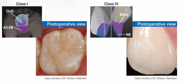 Los tonos de esmalte tienen una translucidez compatible como sustituto del esmalte natural. El uso principal del tono NE es para los dientes anteriores y el OcE es para el área oclusal posterior. Los 3 tonos de esmalte complementarios (sustitutos de NE) se pueden utilizar para las siguientes aplicaciones: TE es para dientes anteriores de alta translucidez, WE es para esmalte blanquecino y YE es para esmalte descolorido o anaranjado.