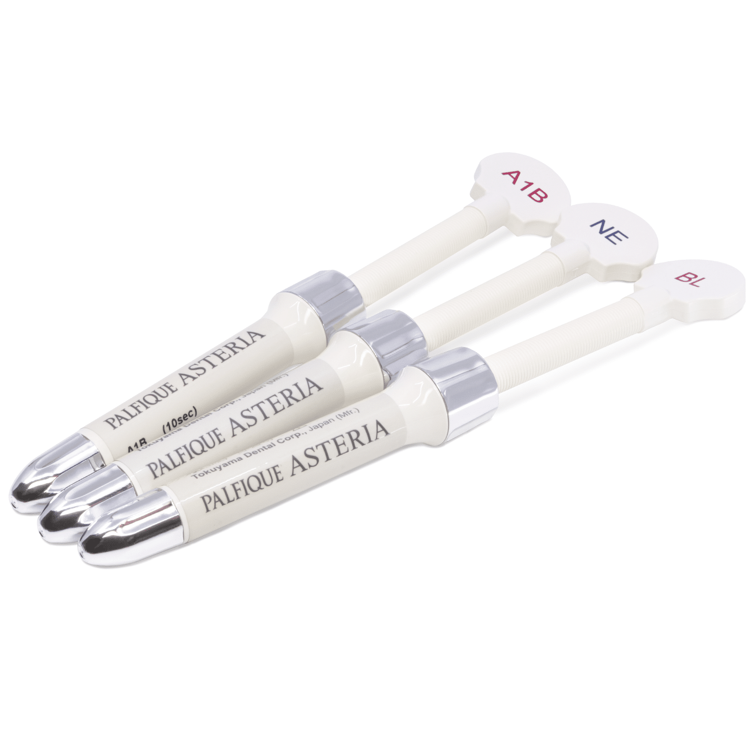 Palfique Asteria presenta un nuevo concepto simplificado de estratificación en 2 pasos. Este sistema integral está compuesto por tonos mínimos; solo 7 tonos Body y 5 tonos de esmalte cubren toda la gama de tonos dentales. El resultado estético se obtiene con el concepto simple de 2 capas de Palfique Asteria, porque los tonos Body replican el croma y el tono y los tonos de esmalte replican el valor.