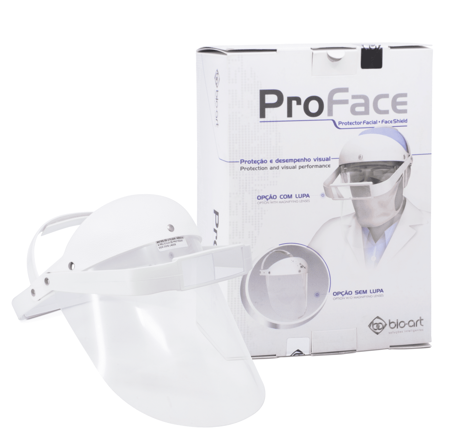 El ProFace Bio-Art con Lupa es un instrumento óptico desarrollado para ser utilizado en la ampliación de imágenes con el objetivo de facilitar la visualización y mejorar el desempeño del profesional en procedimientos técnicos, siendo un Equipo de Protección Personal por poseer una visera para proteger los ojos y el rostro del usuario de derrames de saliva, líquidos, aerosoles, polvo y partículas en general. Sus características físicas cumplen con los estándares internacionales de calidad: excelente rendimiento visual, ergonomía, ligereza, practicidad, fácil limpieza y mantenimiento (cambio de viseras).