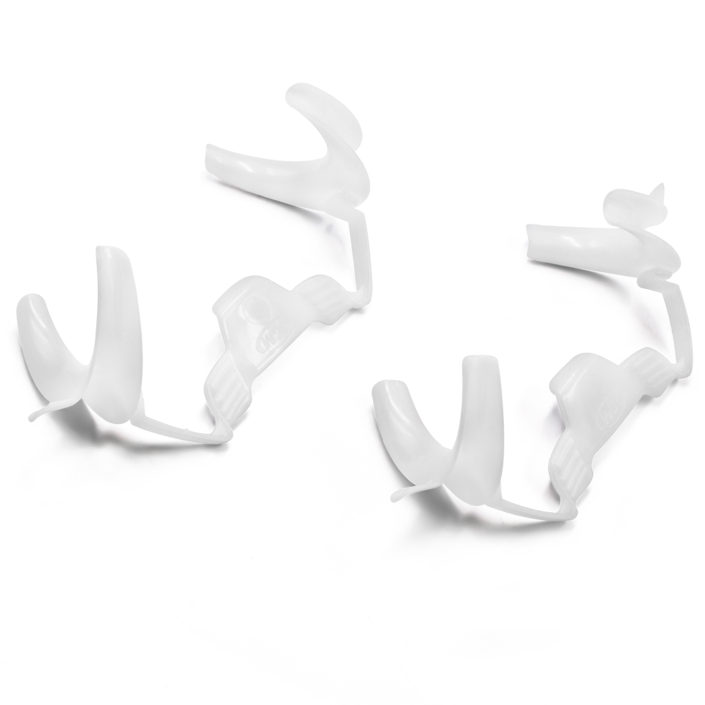 - Aletas para accionamiento: posee dos aletas de apoyo colocadas en el centro de curvatura de las conchas que facilitan la inserción, lo que permite al profesional sujetar y cerrar el producto con tan solo una mano mientras ayuda en la inserción bucal con la otra. El producto cerrado tiene un tamaño bastante reducido y su inserción de esta forma es fácil y práctica.