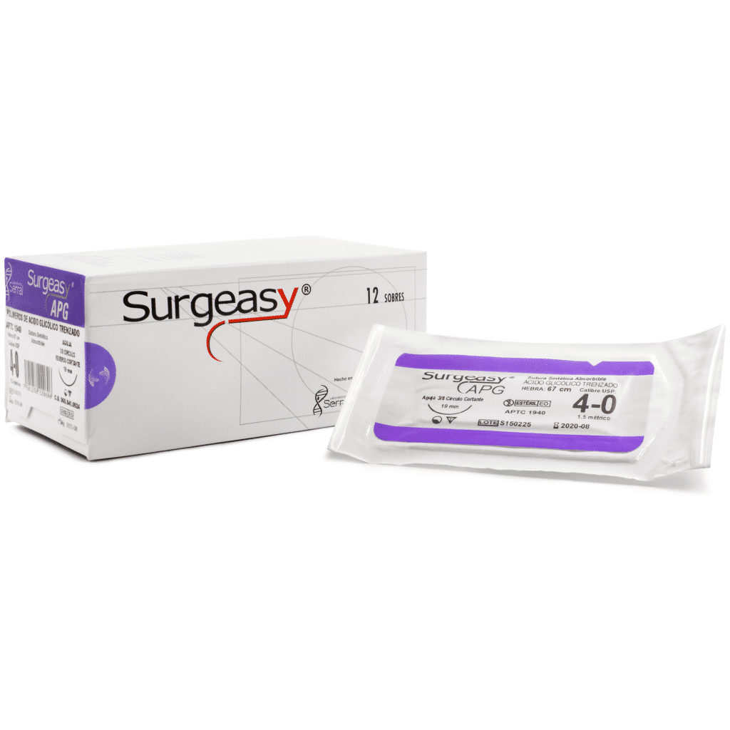 La sutura Surgeasy APG es una sutura quirúrgica sintética absorbible estéril, trenzada y compuesta por Homopolimeros de Glicolida (100%). Están teñidas en color violeta y recubiertas. Las suturas Surgeasy APG cumplen todos los requisitos establecidos por la Farmacopea de los Estados Unidos Mexicanos y por la USP para suturas quirúrgicas sintéticas absorbibles.