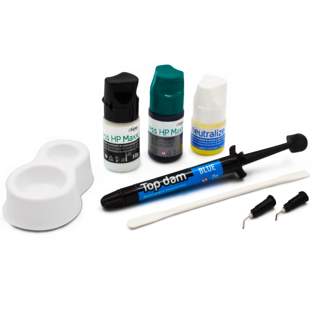 Whiteness HP Maxx de FGM es un blanqueamiento dental a base de peróxido de hidrógeno al 35% para el aclaramiento de dientes vitales y no vitales. Whiteness HP Maxx contiene un conjunto de colorantes especiales que actúan como barrera absorbente que, cuando son irradiados con luz, se convierten en energía térmica que acelera el proceso de penetración del peróxido en la estructura dental y, por consiguiente, acelera el aclaramiento. Whiteness HP Maxx se presenta en dos fases, peróxido y espesante, que permite que el producto sea manipulado con la cantidad necesaria para evitar desperdicios innecesarios y la vida útil del producto sea mayor. El blanqueamiento Whiteness HP Maxx puede ser utilizado con o sin fuentes de aceleración. Gracias a su mayor espectro de absorción de luz, acelera el blanqueamiento, lo que hace que el tratamiento sea más ágil y económico tanto para el odontólogo como para el paciente.