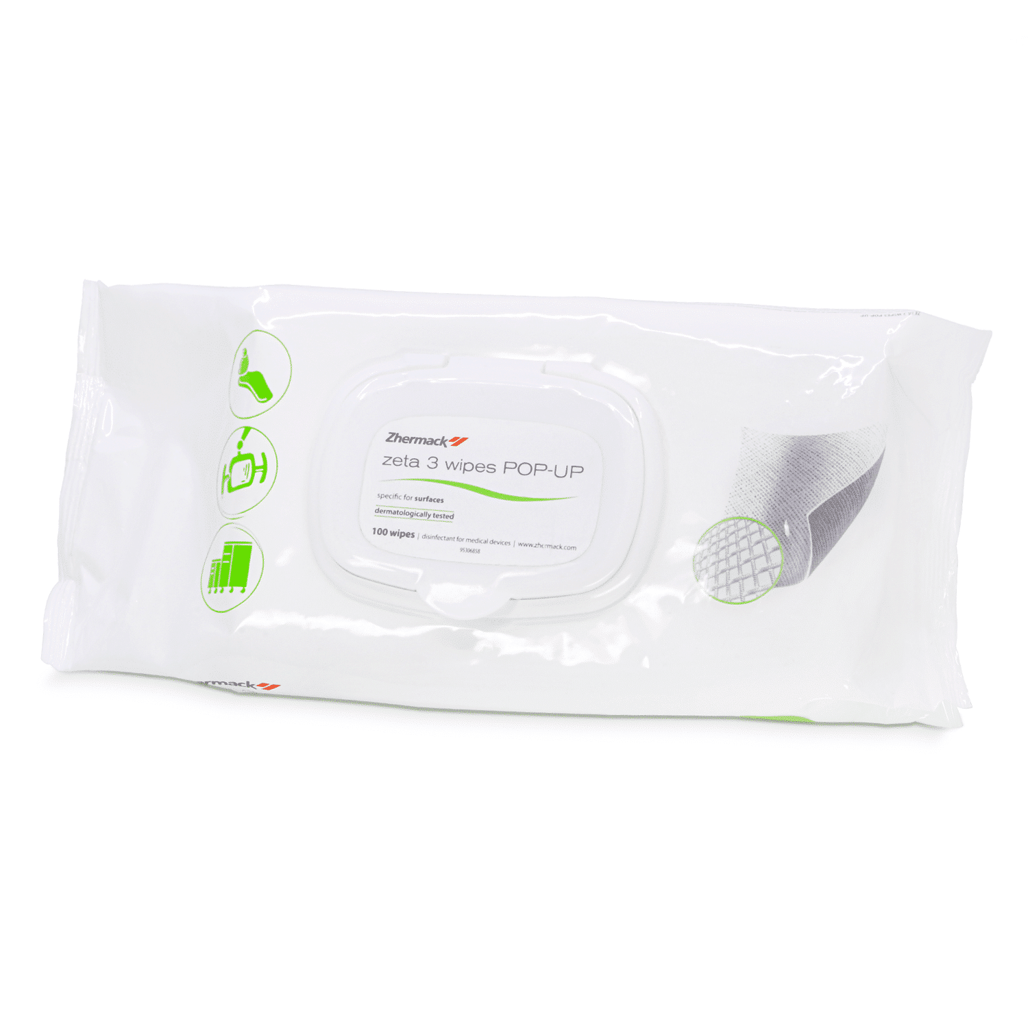 Zeta 3 Wipes POP-UP son toallitas grandes impregnadas con una solución con contenido reducido de alcohol para desinfectar y limpiar rápidamente las superficies de dispositivos médicos, incluidas las más delicadas.